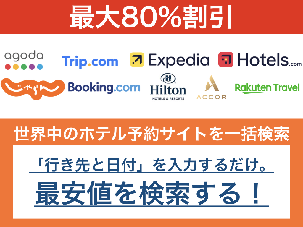 一度の検索で世界中のホテル予約サイト(旅行サイト)を比較できますので、ご希望ホテルの最安値(最大80%OFF)が簡単に分ります。